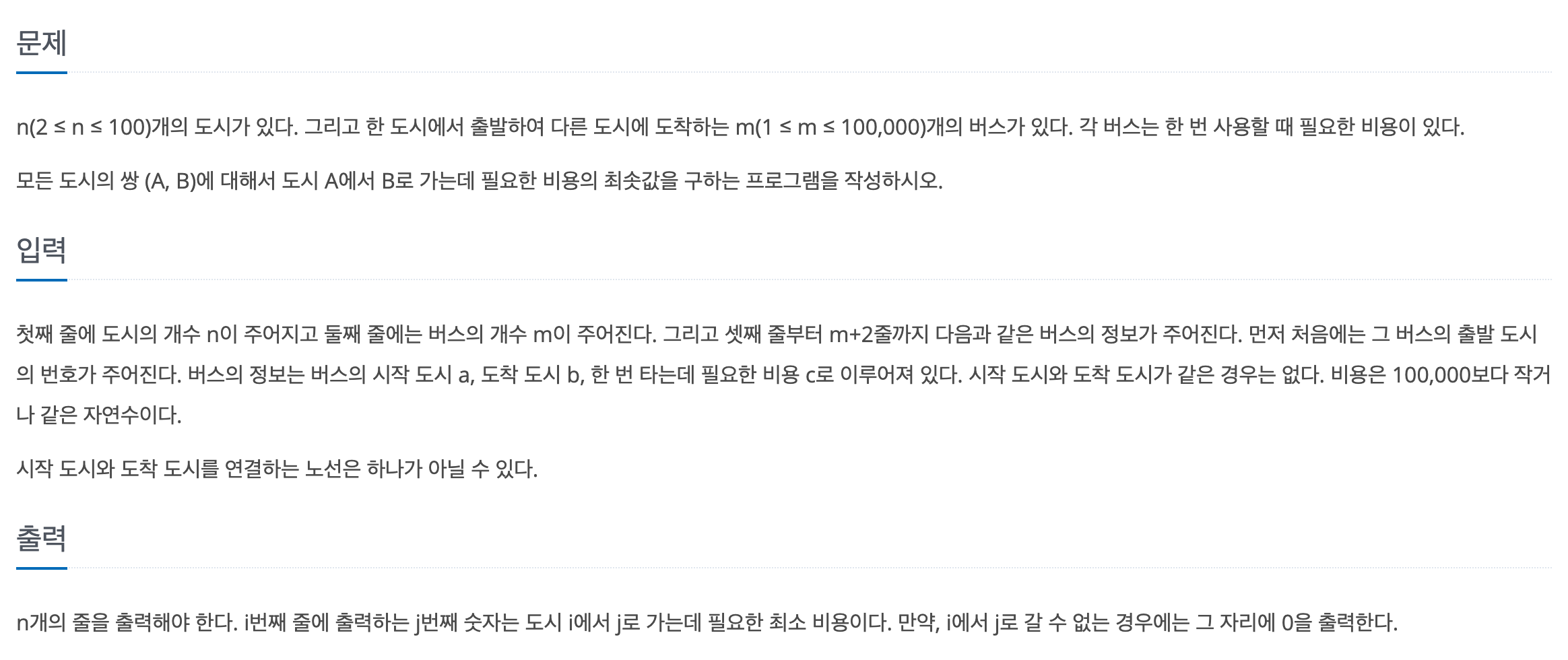주어진 문제는 위와 같다. 최대 100 개의 도시가 주어지고, 도시 간 이동이 가능한 버스 노선들이 주어졌을 때 모든 도시 간 이동 시의 최소 비용을 구하는 것이다. 최단 경로 탐색을 위한 알고리즘은 다익스트라, 벨만 포드, A* 탐색 등 여러 가지가 있지만 위와 같이 모든 노드 간 최단 경로를 구하기 위한 알고리즘으로 문제의 이름과 같은 플로이드 와샬 알고리즘이 있다.